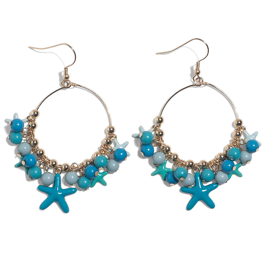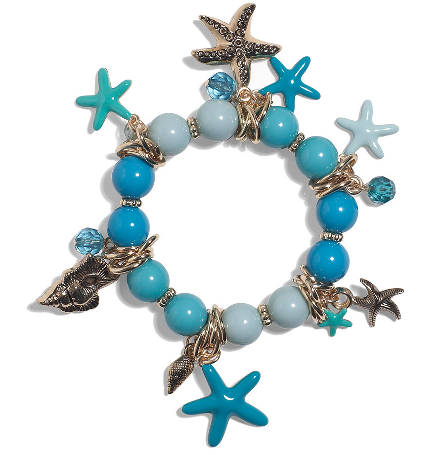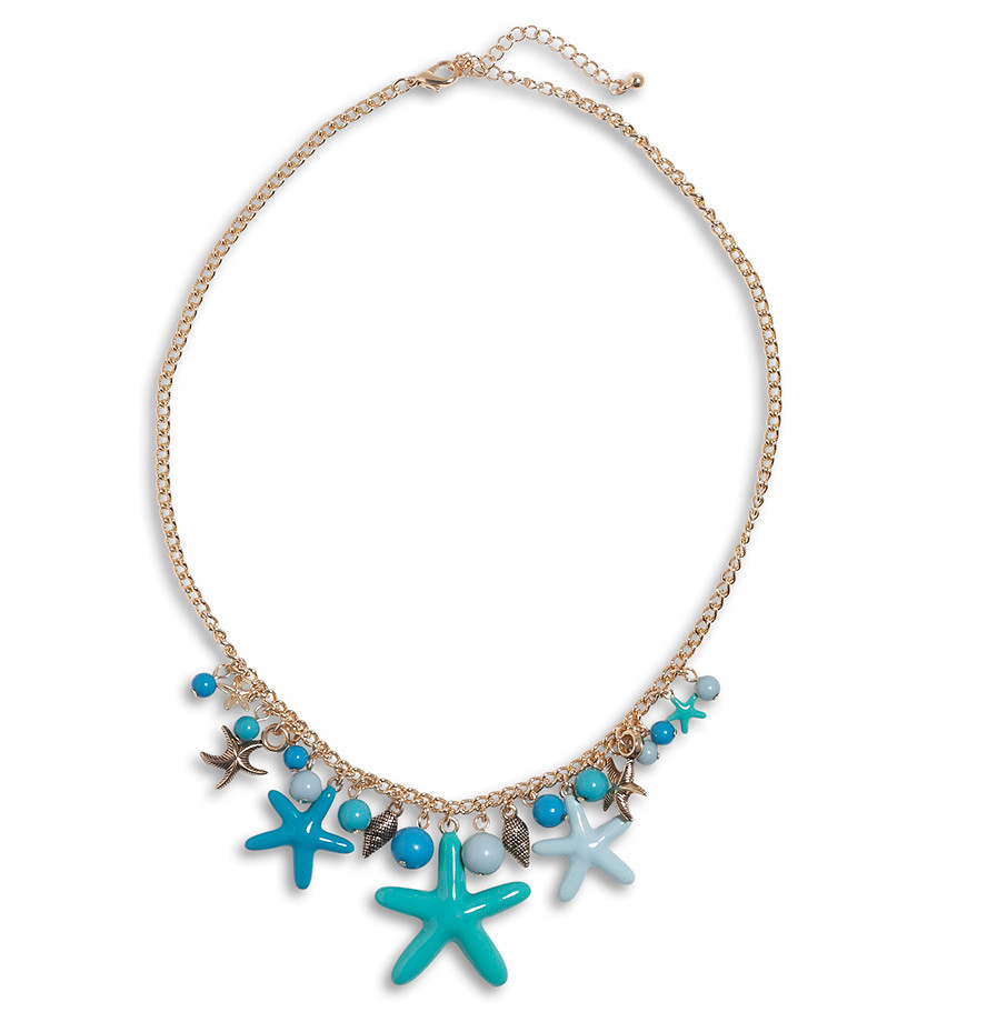 Błękitne dodatki wiążą się z trendem na marynarskie motywy. Ciekawą biżuterię oferuję KappAhl. Uroczy komplecik w iście morskim stylu, to świetny wybór na wakacyjne dni. Kolczyki to srebrne koła ozdobione fantazyjnymi zawieszkami, które nawiązują do podwodnej roślinności. Cena: ok. 17.19 zł
