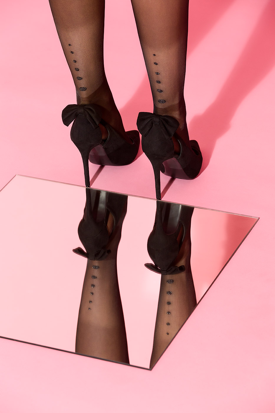 Model EVA to rajstopy w klasyczne, powracające do mody, czarne grochy na czarnym tle. MISSY – z sześcioma kropkami różnej wielkości w pionowym rządku, który z tyłu nogi imituje fantazyjny szew. Rajstopy SALLY tuż pod kolanem jednej nogi i na łydce drugiej ozdabia oryginalny wzór kropek układających się w linie. Na jednej nodze – dwie, na drugiej – cztery, na obu dając efekt wow! W najnowszym lookbooku powraca też jeden z bestsellerów Gabrielli – wzór GINY w nowej odsłonie, który ozdabia nogi kropkami różnej wielkości. Model HARPER to gratka dla fanek geometrycznych motywów – asymetryczne, przecinające się linie, ozdabiające nogi do połowy łydek po uda wyznaczają nowe modowe trendy.