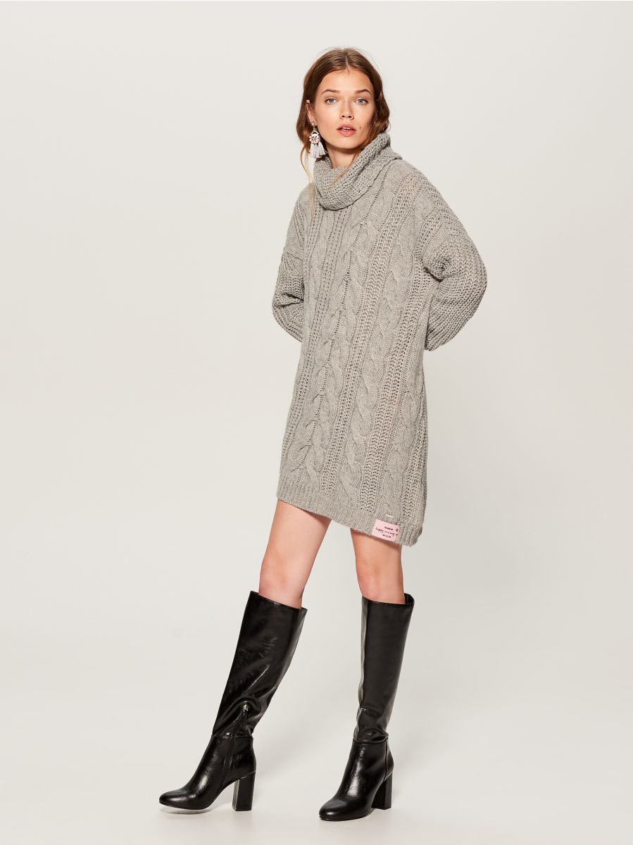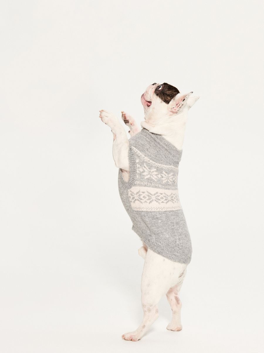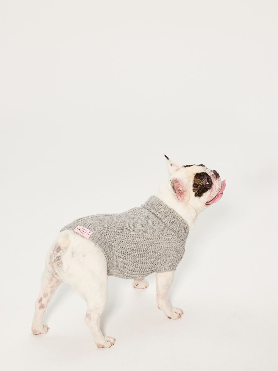Pierwszą z propozycji jest sweterek dla psa z golfem wykonany z ciepłej elastycznej dzianiny o warkoczowym splocie. Pani do kompletu może również zakupić długi ciepły sweter w takim samym szarym odcieniu, także wykonany z dzianiny o podobnym warkoczowym splocie. Szyję zabudowano otulającym golfem, zaś długie rękawy z obniżoną linią ramion zapewniają swobodę ruchu, jaką przynoszą nam fasony oversize. W takim stroju zabawa z pupilem będzie nieograniczona!