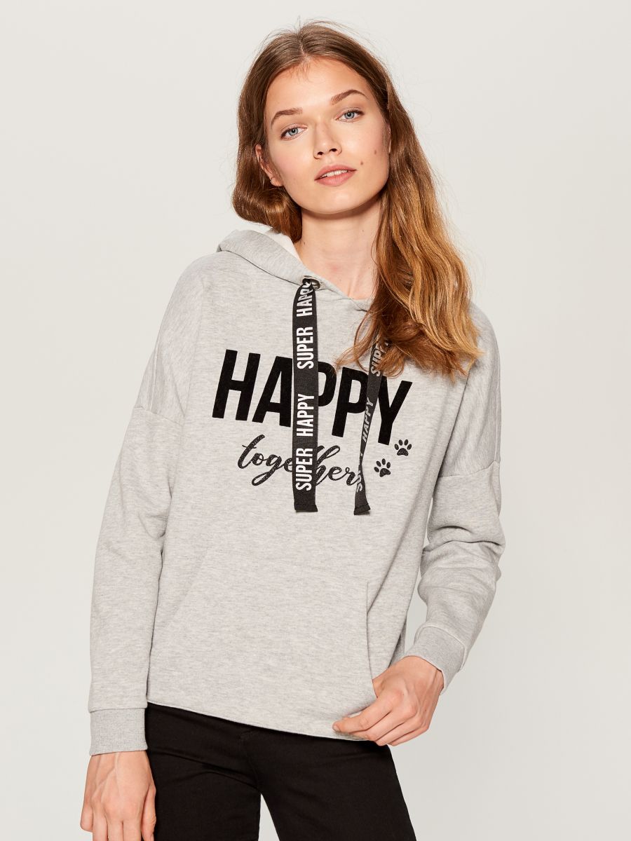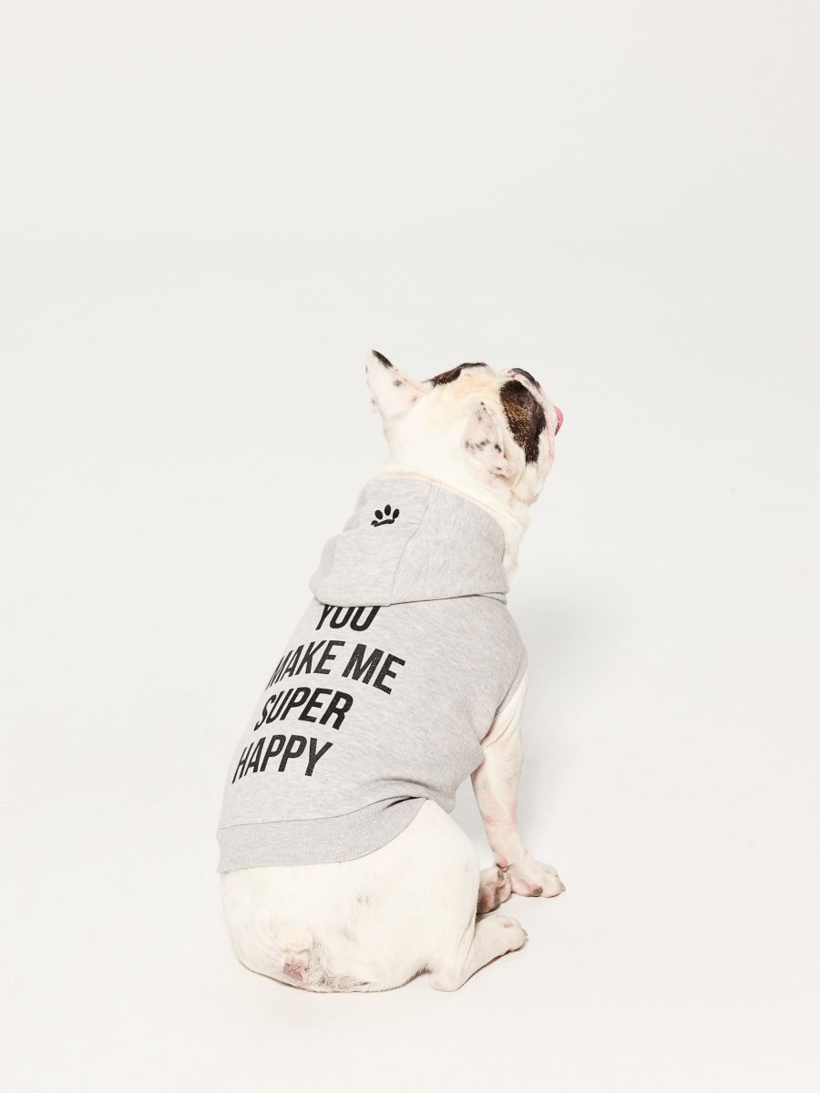 Ostatnim z bliźniaczych zestawów są bluzy z zabawnymi napisami. Model dla pupila wykonany jest z ciepłej dzianiny z połyskującym nadrukiem i zapinany na praktyczne zatrzaski. Do kompletu właścicielka pieska może dokupić ciepłą dzianinową bluzę ze stylowym nadrukiem w kształcie psiej łapki, z przydatną praktyczną, szeroką kieszenią na przodzie, do której możemy schować przysmaki dla swojego pieska.