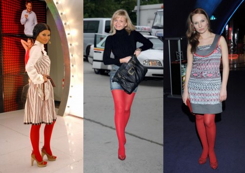 W każdym jesiennym sezonie trend kolorowych rajstop rozpoczynają znane celebrytki. Na wielkich galach, czy też podczas codziennych zakupów, wybierają jako dodatek do sukienek rajstopy w wielu kolorach. Jak widzimy powyżej prym wiodą odważne, czerwone rajstopy, raz dobrane bardziej, a raz mniej trafnie. Katarzyna Skrzynecka oraz Weronika Marczuk wybrały fioletowe rajstopy, a Joanna Brodzik rajstopy w pogodnym kolorze błękitu.