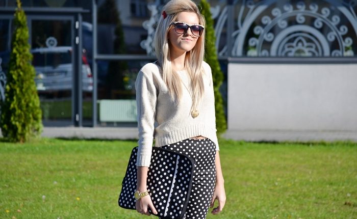 Kropki i grochy to bardzo modny print tej jesieni. W sieciówkach pojawiło się wiele ubrań z tym motywem. Jak dla mnie w stylizacji Karoliny sprawdził się stuprocentowo. Piękne spodnie wyglądają fantastycznie na jej długich nogach. Krótki, beżowy sweterek dodaje stylizacji frywolności. Botki na wysokim obcasie i duża kopertówka nadają stylizacji miejskiego stylu. Fantastyczne jest to, że nasza dzisiejsza bohaterka łamie wszelkie granice i zakłada okulary przeciwsłoneczne o każdej porze roku! Co więcej stylizacja ta sprawdzi się na różne okazje zaczynając od wyjścia na miasto, poprzez spacer, ale także na randkę. Dziewczyny bierzcie przykład z Karoliny!