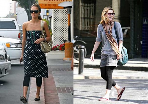 Powyżej widzimy Drew Barrymore oraz Jessicę Albę, które legginsami dopełniły swój strój. Choć obie mogły spokojnie z nich zrezygnować, widać, że bardzo je lubią. Szczupłe nogi aktorek bardzo ładnie wyglądają w obcisłych legginsach, a jak wiadomo – czarny dodatkowo wyszczupla. Również długość – nad kostkę, sprawia, że nogi wyglądają na dłuższe i szczuplejsze.