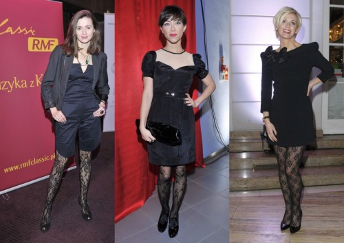 Wzorków na rajstopach jest naprawdę wiele, jednak my postanowiliśmy się przyjrzeć nogom polskich celebrytek. One już wiedzą, że jednokolorowe rajstopy wyszły z mody. Na sławnych nogach przeważają dwa motywy. Pierwszym z nich są rajstopy zdobione roślinnym nadrukiem. Przeważnie są to róże z drobnymi listeczkami. Zauważyliśmy podobne rajstopy na nogach Magdy Mołek, Agnieszki Grochowskiej oraz Natalii Kukulskiej. Tego typu dodatek najlepiej wygląda z czarnymi kreacjami, które nie gryzą się z rajstopami. Oczywiście, obowiązkowo trzeba dopełnić strój wysokimi szpilkami.