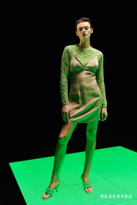 Kluczem do wiosennej kolekcji Reserved jest przenikanie się różnych stylów, trendów, a nawet rzeczywistości. Przestrzeń realna spotyka się z wirtualną, metaliczne faktury z robótką na szydełku. Nawet marmurkowy deseń, charakterystyczny dla tradycyjnego florenckiego papieru, przeszedł metamorfozę, by wylądować zarówno na sukienkach, jak i na ledowych tablicach stanowiących tło tej niezwykłej sesji. Projektanci Reserved wzięli na warsztat modny ostatnio styl Y2K, znamienny dla przełomu tysiącleci. Wówczas – kiczowaty i dość naiwny. Dziś – unowocześniony, bez zbędnych elementów, poważniejszy, bliżej wielkiej mody.