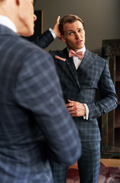 Pan Młody marki DASTAN w tym wyjątkowym dniu nie przestaje być sobą, mimo, że jego wygląd jest dopracowany w najmniejszym szczególe. Jeśli decyduje się na klasyczną elegancję, założy smoking, nauczy się wiązać muchę, a koszulę zapnie na spinki. Stylizację uzupełni dodatkami współgrającymi z suknią czy bukietem Panny Młodej, dobierze więc motywy kwiatowe, które nie odbiorą mu ani grama męskości. Jeśli chce być najmodniejszy na weselu, wybierze dwurzędowy garnitur w kratę. Nie zapomni o doskonałej jakości eleganckich butach i dopasowanym do nich pasku. Jest elegancki i stylowy ale nigdy przebrany. Gotowy może usiąść na chwilę w domu, pomyśleć, odetchnąć i cieszyć się prawdopodobnie najpiękniejszym dniem swojego dotychczasowego życia. Tymi właśnie momentami zainspirowała się podczas tworzenia kampanii ślubnej marka DASTAN.