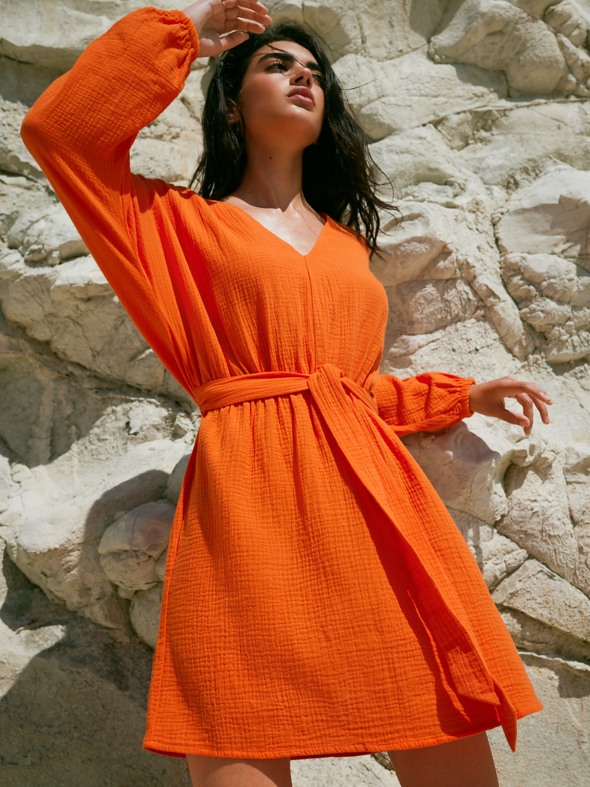 Modny w tym sezonie i bardzo energetyczny kolor pomarańczowy pojawia się w dwóch sukienkach: dopasowanej z wyeksponowanymi ramionami oraz muślinowej z wiązaniem podkreślającym talię.