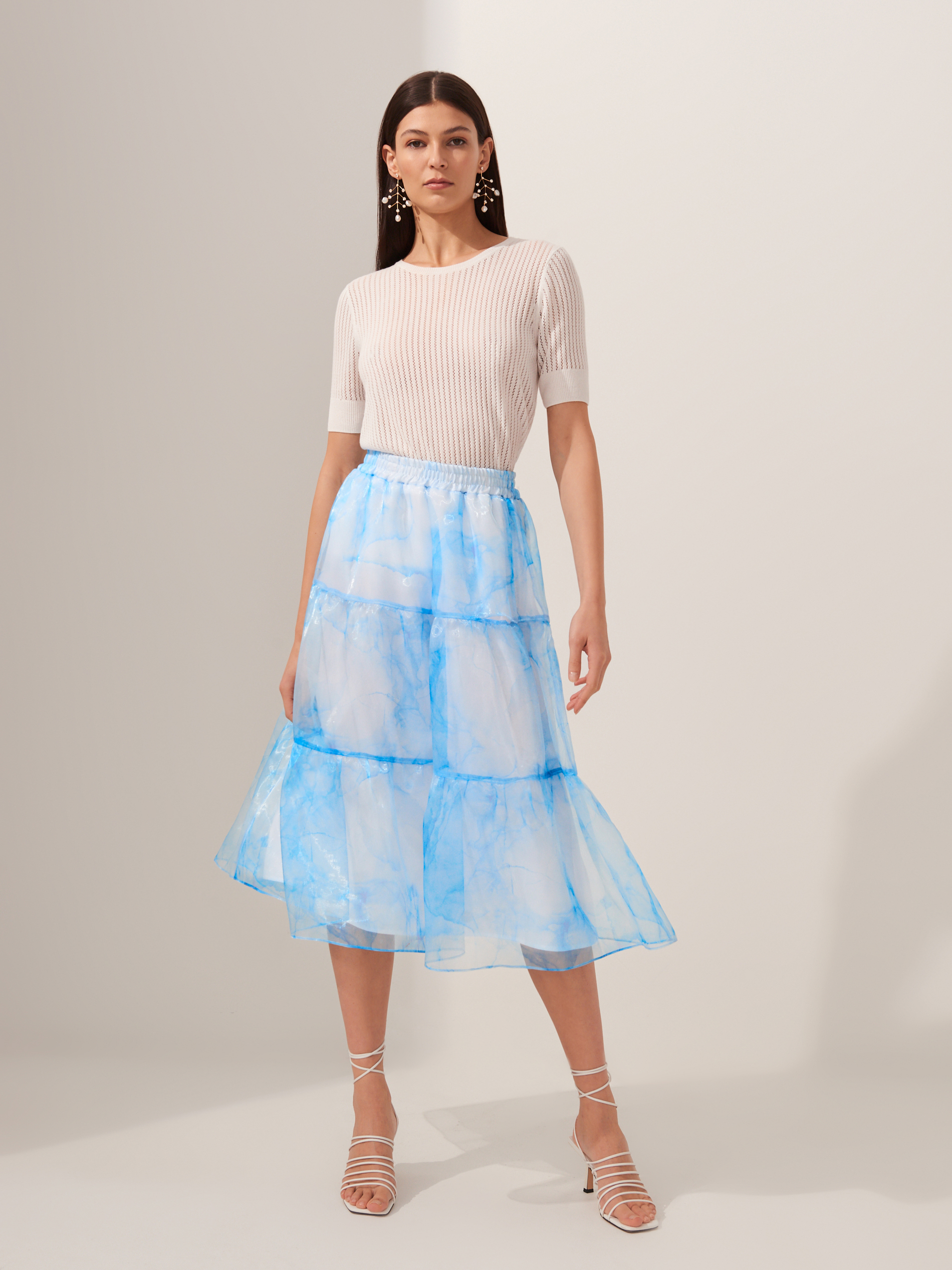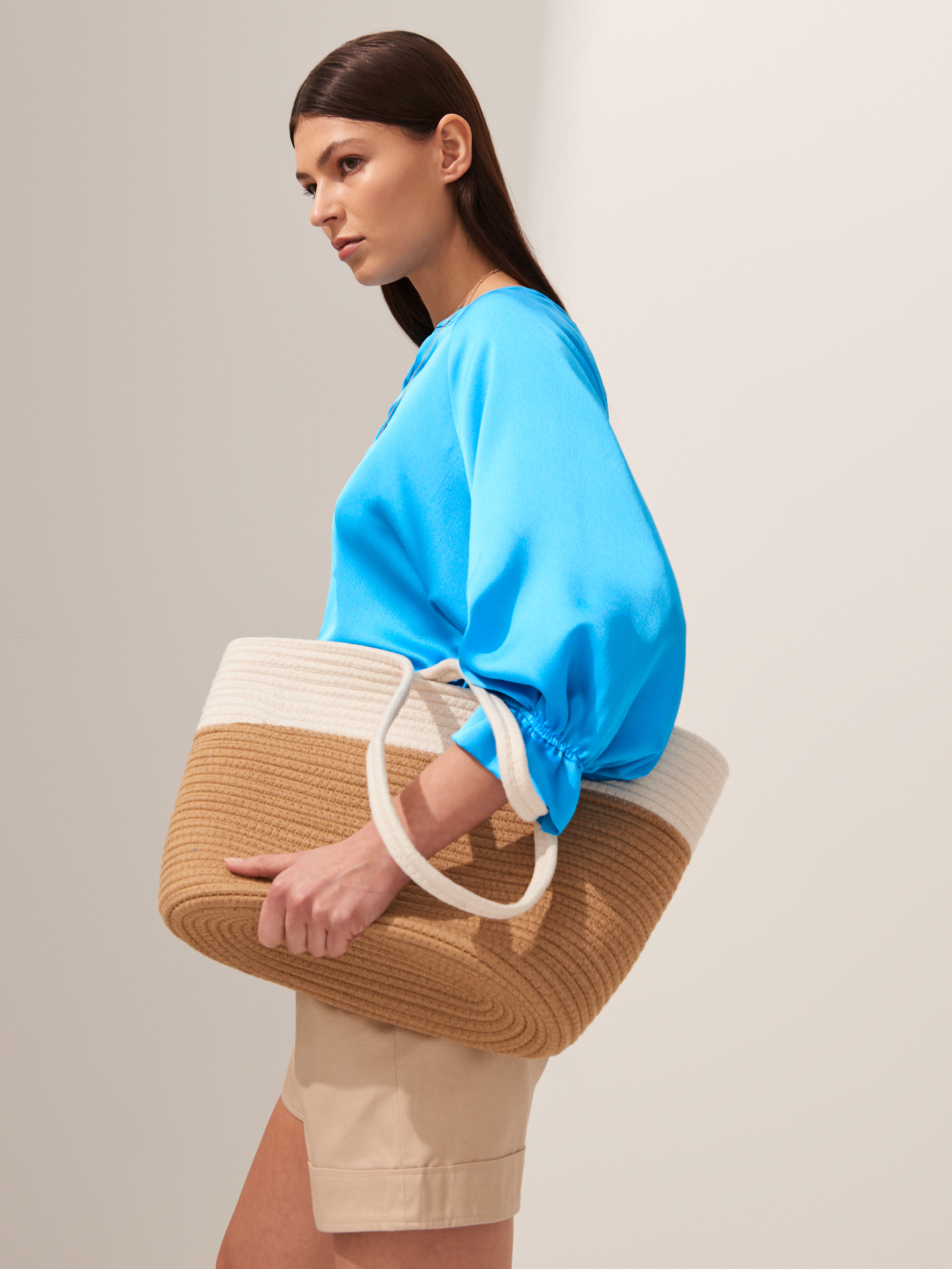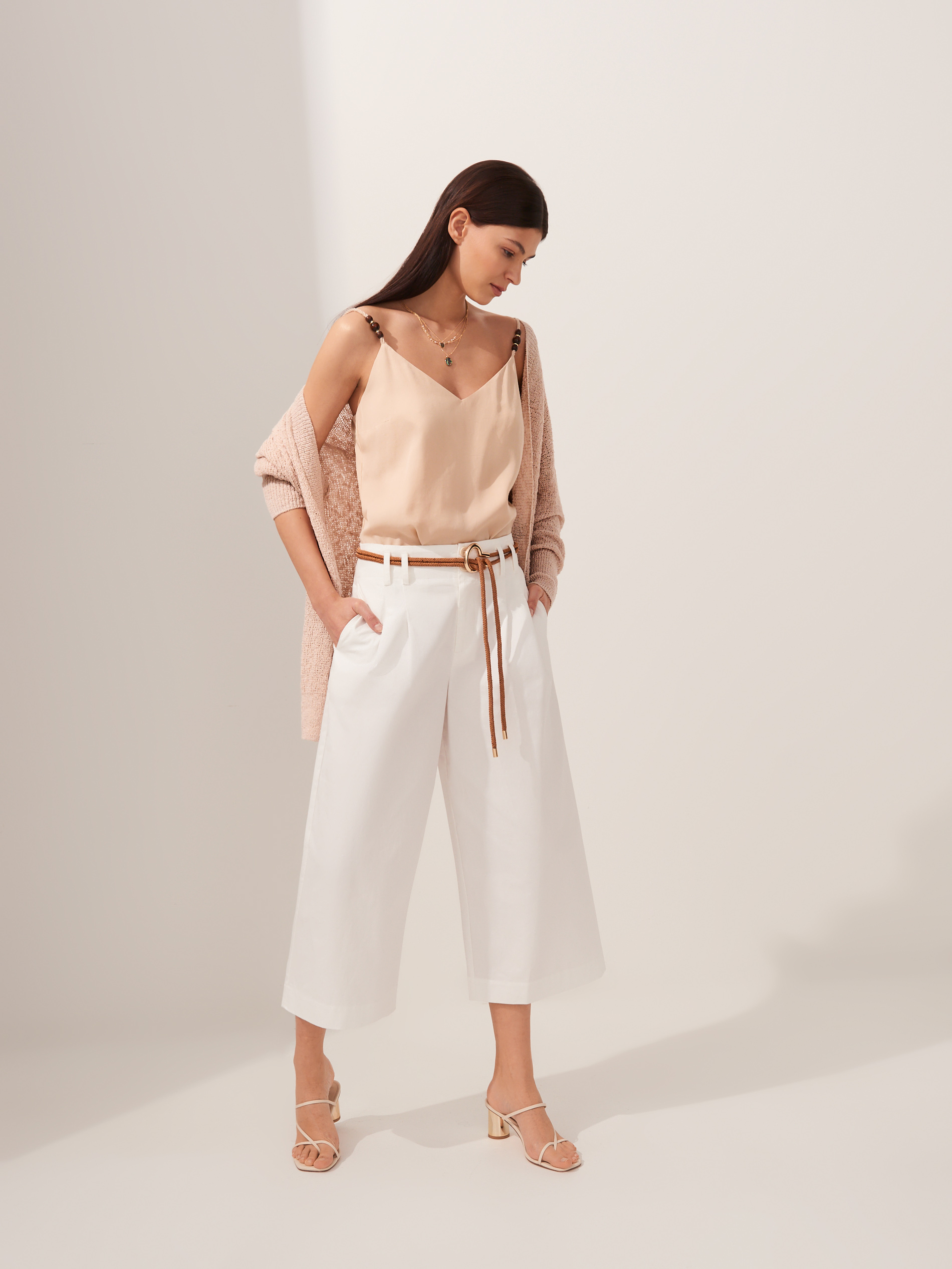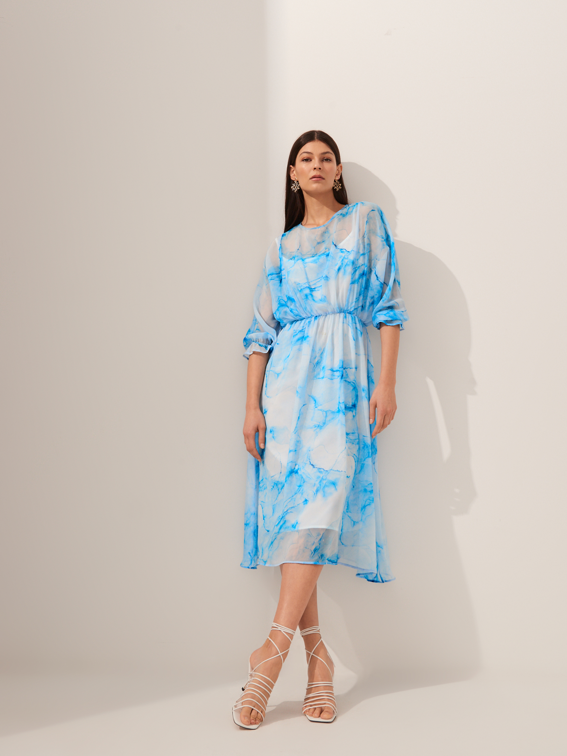 Lookbook dopełniają ciekawe dodatki, jak torby-koszyki w odcieniach bieli i beżu, modne, białe sandałki z cienkimi paseczkami, w sam raz na upalne dni, paski i marszczenia w talii oraz duże kolczyki.