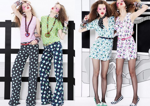 Kolekcja jest w przeważającej części bardzo kolorowa, słodka i urocza. Powyżej mamy przykład typowych nadruków – są jabłuszka, gruszki, wielkie kropy i kolorowe paski. Z pewnością są to propozycje dla kobiet z dużą dozą poczucia humoru i dystansem do rzeczywistości. Spróbujcie sobie tylko wyobrazić spotkanie biznesowe w zestawie w kolorowe gruszki.. mogło by być całkiem zabawnie.