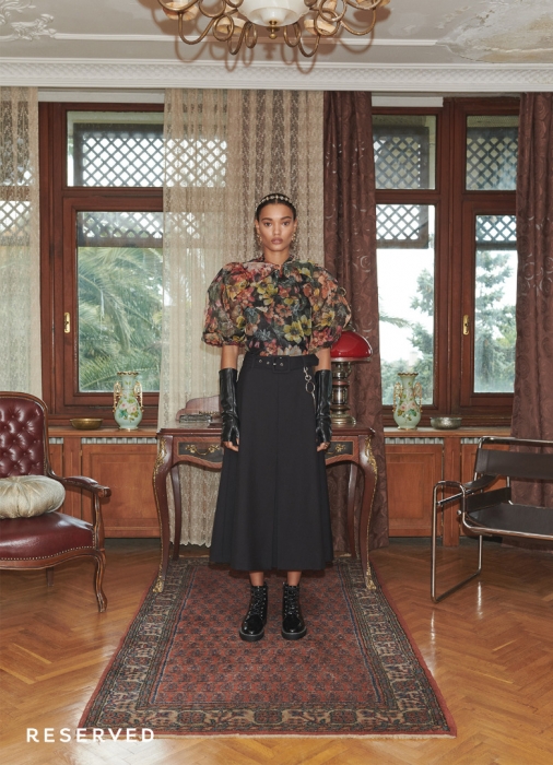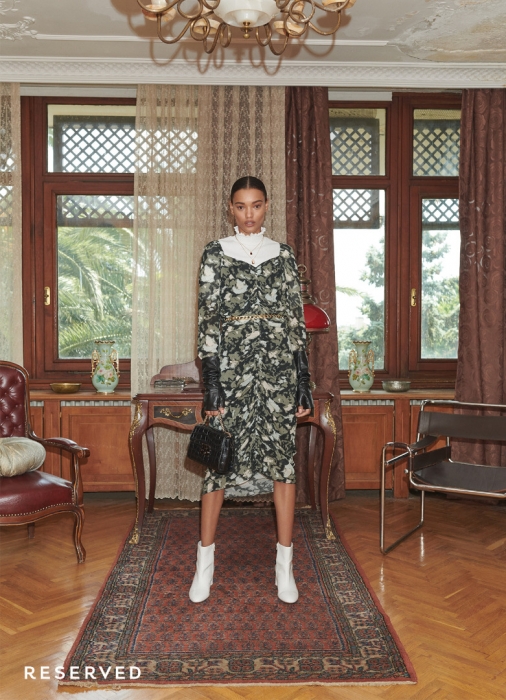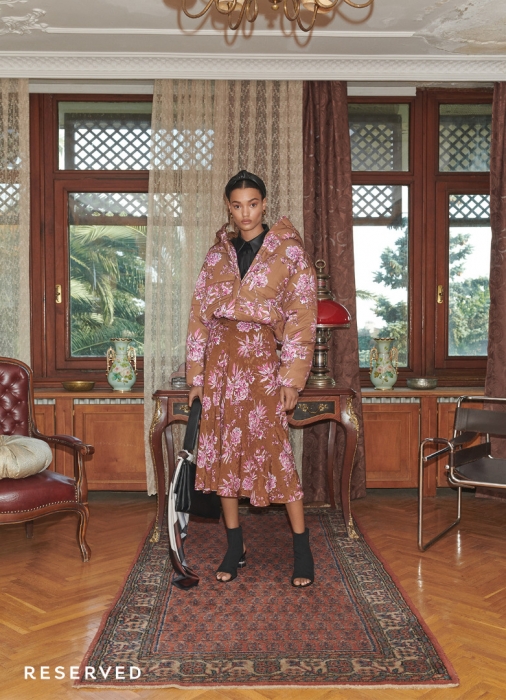 Damską linię Reserved na jesień 2019 zaprojektowano w trzech głównych konwencjach. Dominują fasony w historycznym stylu jak zabudowane satynowe sukienki, kreacje za kolano z bufiastymi rękawami oraz sukienki z haftami i kryzą. Z drugiej strony uwagę przykuwają bogato zdobione we wzory sukienki i spódnice w klimacie boho. Te o długości maksi dekorowane są we wzór jak z tapet z lat 50. a krótsze, szyfonowe – w kwiaty. Retro charakter całości przełamują awangardowe projekty jak lakierowane trencze, popularne dwie dekady temu płaszcze z misia, kimonowe żakiety czy obszerne golfy. Fasonem, który spina wszystkie tendencje jest krótka wieczorowa puchówka w kwiaty.