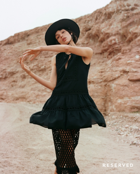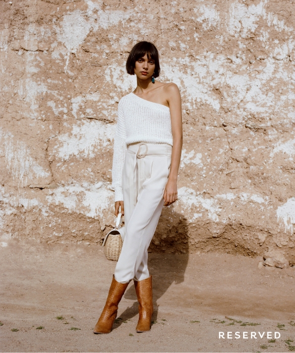 W letniej , damskiej kolekcji główną rolę grają sukienki. Wyróżniają się te koronkowe, romantyczne oraz ażurowe, przypominające sieć rybacką. Z siatek w różnym wydaniu projektanci Reserved szyją także spódnice. Mocnym akcentem są też sukienki zdobione falbanami w stylu flamenco i dopasowane tuniki w pasy. Do stylu festiwalowego nawiązują motywy wzoru tie die, który lata temu narodził się w Kalifornii. Z kolei bluzki i szerokie spodnie w kolorze miedzi wyglądają wprost jak z wąskich uliczek targów w Marakeszu. Minimalistkom do gustu przypadną koronkowe bluzki w wiktoriańskim stylu z baskinką, prosty lniany trencz czy asymetryczny sweter z jednym rękawem. Skórzane saszetki na szyję, mini koszyki i worki to idealne uzupełnienie na wskroś nomadzkiej kolekcji.
