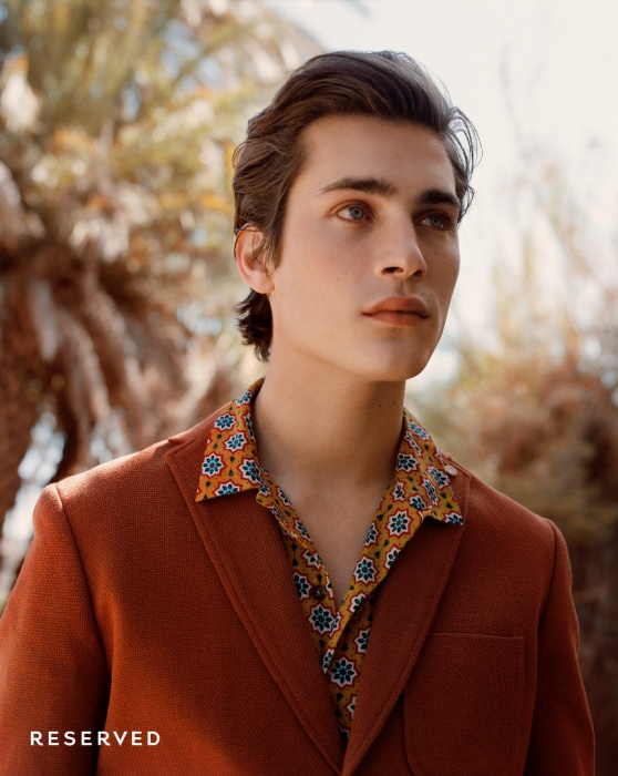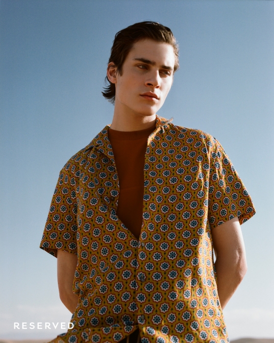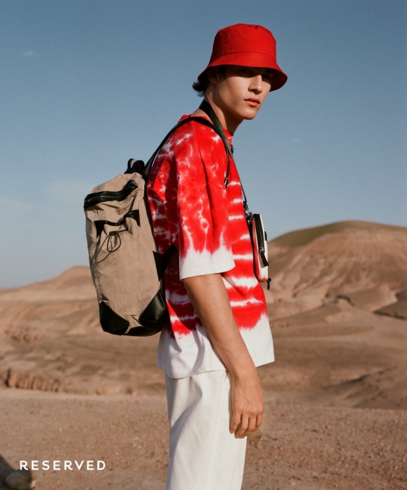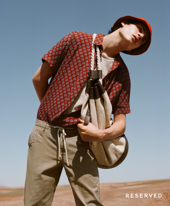 Tematem przewodnim męskiej linii Reserved są wygodne, oversize’owe fasony. Garnitury w przybrudzonych kolorach lub barwach ziemi mają prosty, jednorzędowy krój i zestawiane są z sandałami. Ważnym motywem w tym sezonie stają się wzory. Te w stylu retro zdobią przede wszystkim lejące koszule, które dla kontrastu zestawiono z szerokimi szortami. Lniane góry w męskiej letniej kolekcji Reserved łączone są z bermudami w pasy tworząc iście nomadzki look. Marynarki w kolorze khaki i wiatrówki z kapturem nawiązują do stylu safari. Tak jak w damskiej linii tu także pojawiają się printy typu tie die, przede wszystkim na T-shirtach rodem z Coachelli. Na dodatek? Atrybuty podróżnika czyli rybackie kapelusze, worki XXL i oversize’owe torby na ramię, które nadają całości globtroterski charakter.