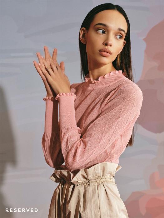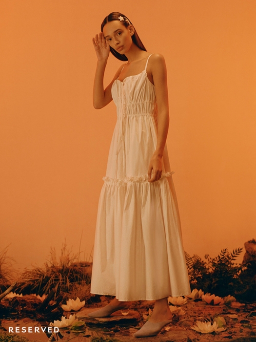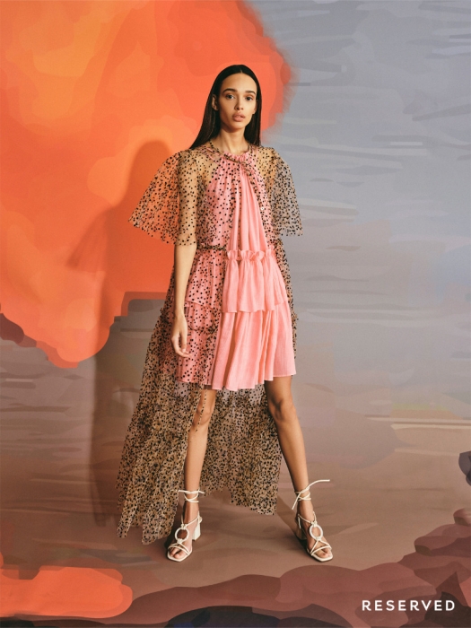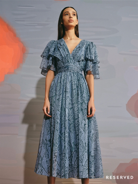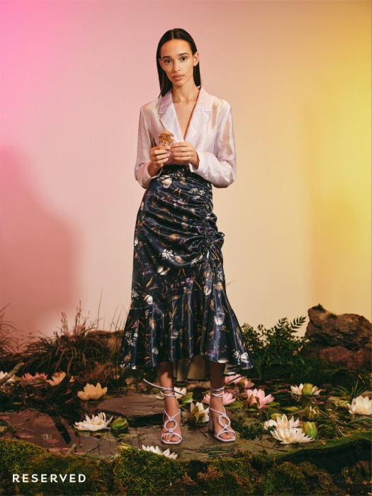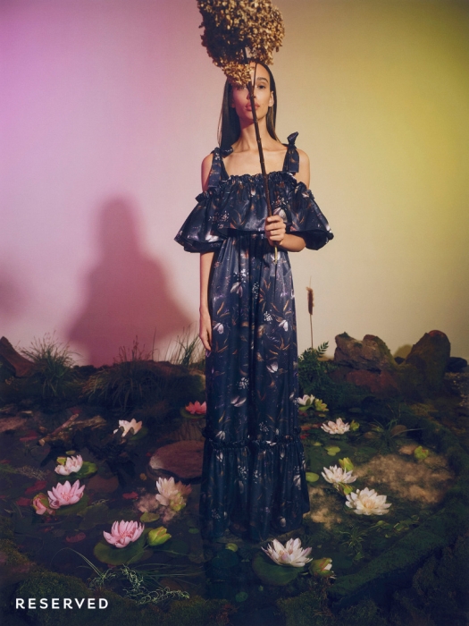 Jedną z wizualnych inspiracji stała się szekspirowska Ofelia, która, jak w obrazie Johna Everetta Millaisa, unosi się na wodzie w długiej sukni ozdobionej wyhaftowanymi srebrną nicią kwiatami. Reserved zapożycza tę estetykę, by zaprezentować ją we współczesnej odsłonie – bardzo nowoczesnej, ale niepozbawionej romantyzmu. Stąd motywy zatrzymanych w ruchu alg i falującej flory wodnej, oraz tonące w czerni kwiaty niczym z barokowego malunku, nadrukowane zarówno na śliskiej satynie, jak i na sportowym nylonie. Z tych materiałów powstały sukienki maxi z dekoracyjną falbaną na dekolcie, bluzki z „napompowanymi” rękawami, spódnice midi z marszczeniami, a także legginsy.