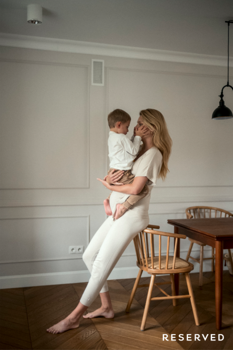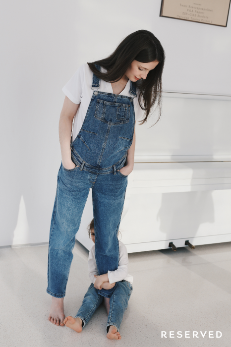 Fasony zostały pomyślane tak, by ewoluować wraz z sylwetką. Elastyczna talia, podwyższony stan, kopertowe zapięcia oraz marszczenia z gumeczkami dopasowują się do różnych typów sylwetek. Dzianiny i luźniejsze fasony zapewniają komfort w każdym miesiącu ciąży, a niektóre modele sprawdzą się także później, podczas karmienia (np. top z odpinanymi ramiączkami czy kopertowa sukienka). #ReservedForMum na wiosnę to kilka modeli dżinsów, w tym ogrodniczki ze specjalnie wyprofilowanym miejscem na brzuch, a także romantyczne bluzki i sukienki z falbanami. Nie zabrakło okryć wierzchnich: mamy funkcjonalny, przyjemny w dotyku płaszcz przeciwdeszczowy w liliowym kolorze oraz pikowaną zieloną podpinkę. W kolekcji znajdują się również zestawy do ćwiczeń – dresy, krótki top i legginsy z wysoką talią.