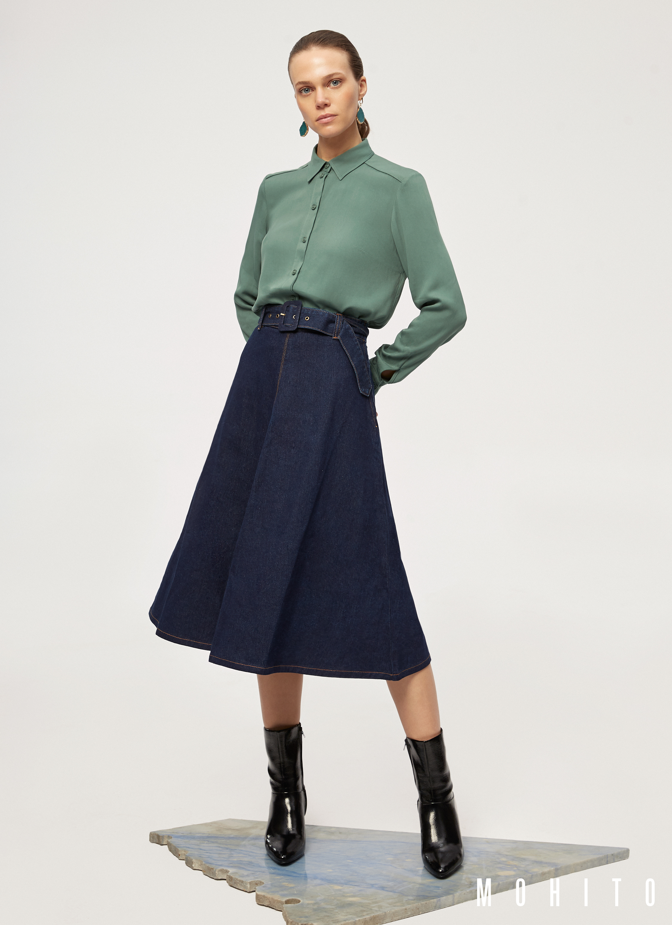 Pośród propozycji marki na wiosnę 2020 uwagę zdecydowanie przykuwa hipnotyzujący odcień zieleni sukienki oraz koszuli, który sam może stworzyć cały look, lub pięknie współgrać z granatem denimu.