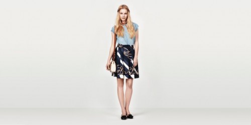 Podobne połączenie kolorystyczne, nawiązujące do marynarskiego stylu. Również grzeczna i ułożona wersja dla przykładnych dziewczynek. Niebieska bluzka naszym zdaniem nie do końca zgrywa się z spódnicą we wzory, jednak może kogoś przekonuje ten zestaw?
