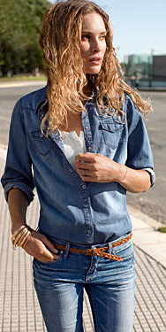 Pod dżinsową koszulę załóż kontrastujący jasny top i nie zapinaj wszystkich guzików. Przemyślana niedbałość doda atrakcyjności całej stylizacji. Dżinsowe koszule świetnie sprawdzają się na popołudniowe wyjścia ze znajomymi i weekendowe wypady za miasto. Kojarzą się trochę ze stylem farmerskim, ale można nosić je także z dodatkami w stylu glamour.