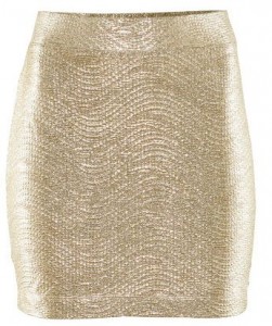 Na sylwestrową zabawę wcale nie musisz ubierać sukienki. Jeżeli masz w domu czarną marynarkę lub bolerko i jakąś fajną wieczorową bluzkę wystarczy, że dokupisz modną spódnicę i sama stworzysz równie efektowny zestaw. Ponieważ połyskujące materiały są obecnie bardzo na czasie, polecamy błyszczącą złotą spódniczkę H&M. Spódniczka jest wykonana z fakturowanego dżerseju i ma szeroką elastyczną talię. Ponieważ jest bardzo obcisła skutecznie podkreśli kobiece kształty.