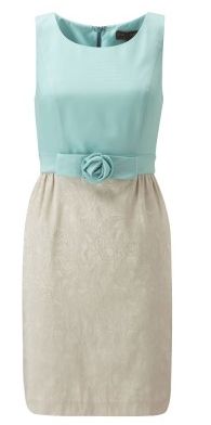 Miętowy odcień górnej części sukienki sprawi, że Twoja skóra będzie wyglądała świeżo, promiennie, a przede wszystkim młodziej! Beżowa spódnica w połączeniu z cielistymi rajstopami optycznie wydłuży dolne partie sylwetki. Dla wzmocnienia efektu wybierz cieliste pantofelki- nogi będą wyglądały w nich na o wiele dłuższe!