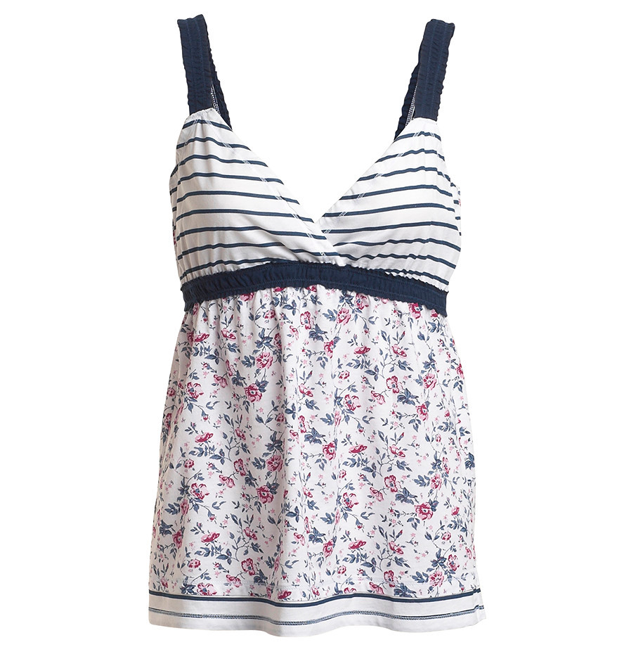 Luźny top na szerokich ramiączkach to połączenie dwóch, gorących trendów: kwiecistych wzorów i marynarskiego stylu. Górną część topu zdobią poziome, granatowo- białe pasy, które optycznie powiększają biust. Kojarzą się z wakacyjnym, marynarskim stylem ubioru. Top jest odcinany pod biustem, a jego dolna część jest luźna i kwiecista. Świetnie tuszuje drobne mankamenty figury w okolicach brzucha.