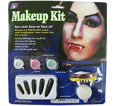 W skład zestawu wchodzą farbki do malowania (3 kolory), czarne tipsy, sztuczna szcęka (niezbędnik wampirzycy), pędzelek oraz gąbka do malowania twarzy. Szczęka wykonana jest z miękkiego tworzywa, nie ma więc obaw, że uszkodzisz swoje uzębienie. Swobodnie możesz więc także ,,kąsać” swoich znajomych 😉 Tipsy mają różną długość od 2,5 cm do 4,5 cm. Cały zestaw do charakteryzacji kosztuje zaledwie 19 zł.