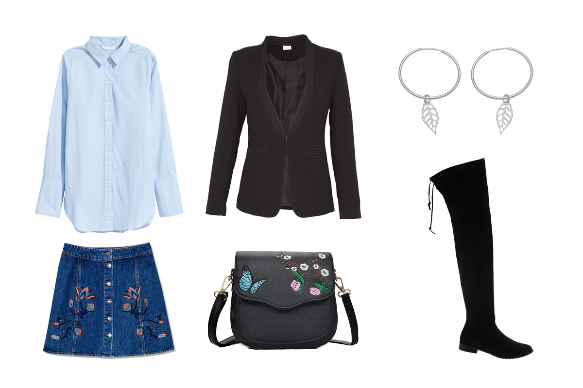 Ostatnią z propozycji jest połączenie czerni i błękitu, które często stanowi typowe biurowe zestawienie. Również na co dzień, a nawet na wieczorną imprezę możesz wybrać to zestawienie kolorystyczne i wyglądać świetnie. Ta sama czarna marynarka zostawiona została tutaj z dżinsową spódniczką z szalonymi nadrukami pod postacią kwiatów, które znalazły się również na odpowiednio dobranej torebce. Pod marynarkę zakładamy luźną niebieską koszulę H&M, a stylizację uzupełniamy zamszowymi muszkieterkami. Dopełnieniem stylizacji będą dziewczęce kolczyki typu koła.