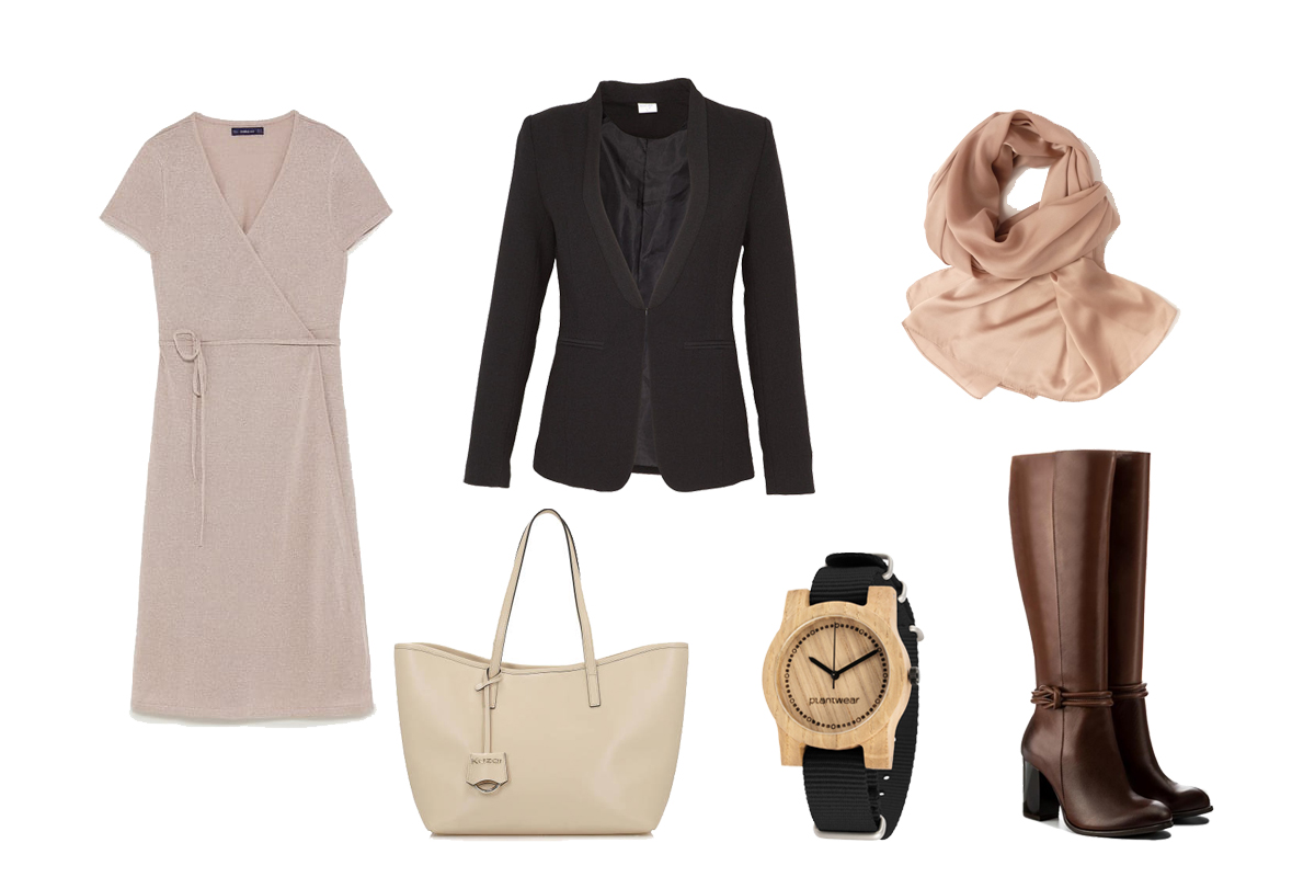 Na nieco bardziej formalne okazje możemy również wybrać czarną marynarkę, jednak wcale nie musimy wyglądać przy tym sztywno i biurowo. Wspomniany żakiet łączymy tutaj z sukienką z Zary o kopertowym kroju i neutralnym kolorze. Taki krój pasuje do każdej sylwetki, dlatego każda kobieta będzie wyglądać w niej świetnie. Do sukienki dobieramy brązowe skórzane kozaki na obcasach, a uzupełnieniem stylizacji będzie jedwabna apaszka w kolorze zbliżonym do sukienki. Z dodatków wybieramy miejską torbę marki Kazar w odcieniu nude oraz modny drewniany zegarek, który nada stylizacji współczesnego wyrazu.