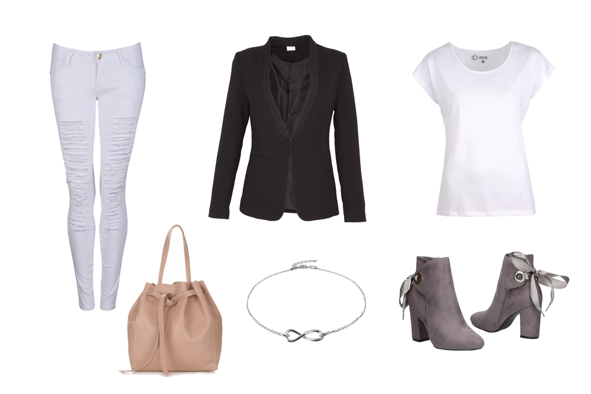 W codziennych stylizacjach – niezobowiązujących i luźnych – czarna marynarka będzie świetnym dodatkiem w połączeniu z jeansami. I to praktycznie z każdym rodzajem! Tak jak wspomnieliśmy sportowa elegancja jest mega modnym stylem, dlatego pod elegancką marynarkę możemy złożyć zwykły t-shirt, najlepiej w białym kolorze, który będzie świetnym uzupełnieniem czarnej marynarki. Jeżeli chodzi o jeansy w zależności od tego co preferujecie, możecie wybrać jeansy w odcieniach niebieskiego, bieli lub czerni. My proponujemy białe jeansy z modnymi dziurami, które świetnie kontrastować będą z eleganckim żakietem. Biało-czarną stylizacje przełamujemy torebką workiem w kolorze brudnego różu oraz botkami z zamszu w odcieniach szarości, które spokojnie możecie zamienić na białe Adidasy. Biżuteria nie stanowi w tym zestawie pierwszego planu, a jedynie delikatne tło. W takim stroju spokojnie możecie wybrać się na miasto, na zakupy, na spotkanie z przyjaciółką czy też spacer z wózkiem.