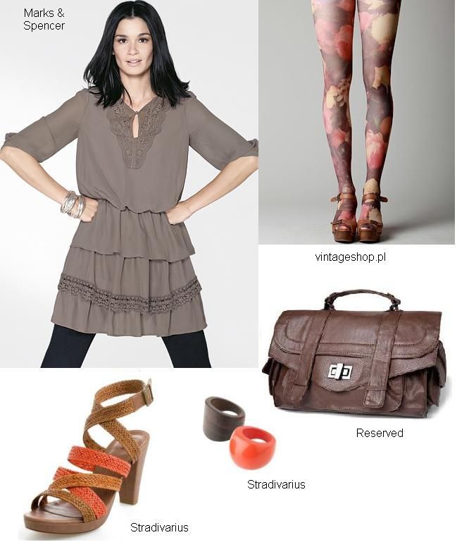 Pomarańcz to jeden z najgorętszych kolorów tego sezonu. Jednak w wersji neonowej jest dobry jedynie dla kobiet o południowym typie urody, czyli z mocną oprawą oczu, oliwkową cerą i ciemnymi włosami. Takim paniom, neonowe stroje dodadzą blasku i energii. Dla tych z Was, które mają słowiańską bądź skandynawską urodę lub zwyczajnie, nie chcą zwracać na siebie uwagi zbyt jaskrawym ubiorem, przygotowaliśmy nieco spokojniejszą alternatywę. Brązowa tunika z najnowszej kolekcji Marks & Spencer będzie pasować na wiele okazji- możesz założyć ją zarówno na zakupy, uczelnię czy randkę z chłopakiem. Falbanki w dolnej części sukienki dodają nutkę romantyzmu, a uniwersalna długość sprawia, że możesz założyć zarówno cienkie rajstopy, jak i ciepłe legginsy. Dla tych z Was, które lubią czasem zabłysnąć czymś oryginalnym, proponujemy rajstopy z ciekawym wzorem. Możesz zakupić je w internetowym sklepie vintageshop.pl