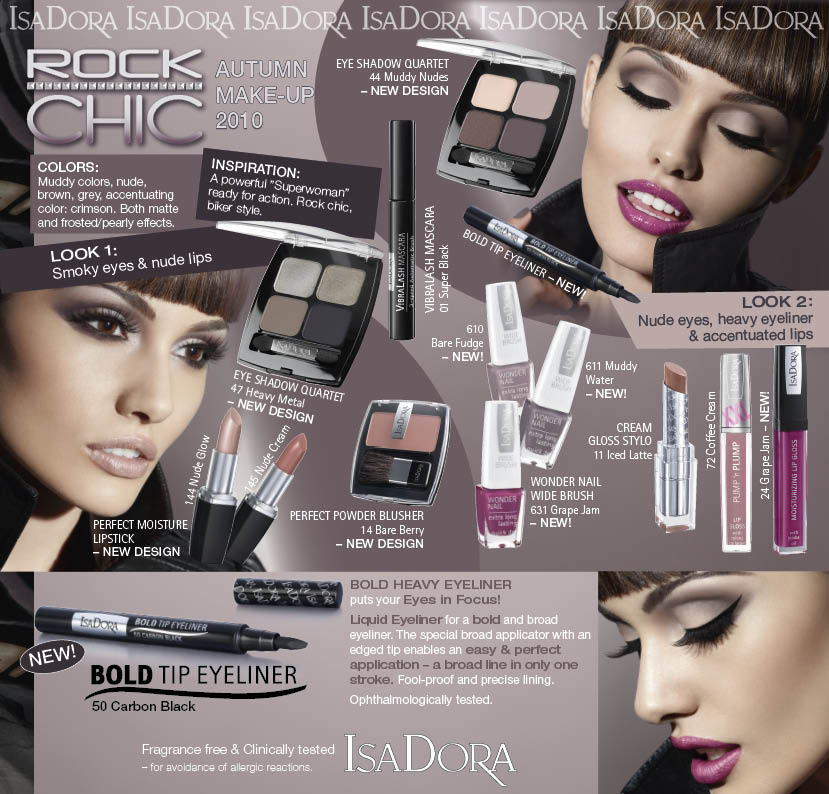 W tym sezonie panie będą miały wiele powodów do zadowolenia. IsaDora przygotowała dla nas świetny zestaw kosmetyków, dzięki którym można wyczarować naprawdę efektowny makijaż. Projektanci są zgodni: koniec z brokatem na powiekach! I choć inne wiodące marki kosmetyczne nadal przystają przy typowo romantycznym makijażu (różowe poliki, pastelowe powieki), IsaDora zdecydowała się zaproponować nam to, co lubimy najbardziej, to, co pasuje niemalże każdej z nas.