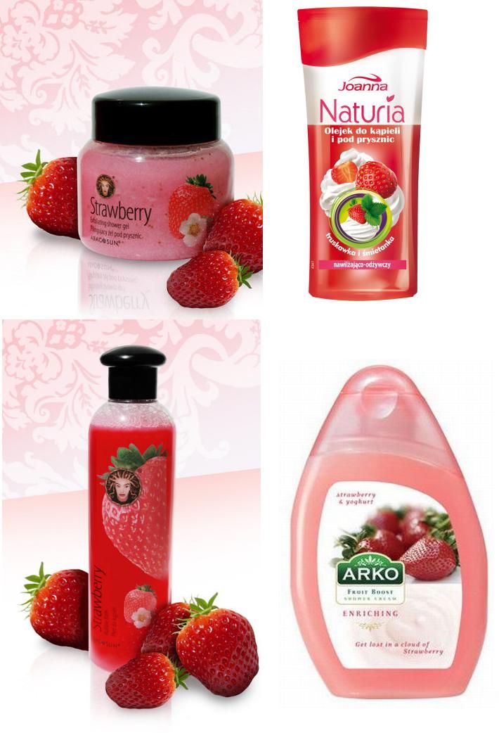 Wypróbuj truskawkowy, peelingujący żel pod prysznic i truskawkowy płyn do kąpieli Abacosun, olejek do kąpieli i pod prysznic truskawkowo- śmietankowy Naturia Joanna lub truskawkowo- jogurtowy żel pod prysznic Arko.