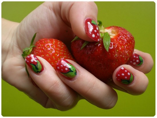 Jeśli lubisz wyróżniać się z tłumu, sięgnij również po zielony lakier i namaluj owocowe wzorki. Taki manikiur najlepiej prezentuje się na paznokciach o średniej długości.