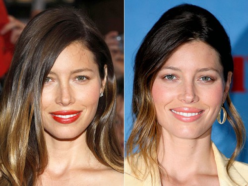 Zacznijmy od byłej partnerki Justina Timberlake’a – Jessici Biel. Znana również z serialu „Siódme Niebo” aktorka ma bardzo wyraziste rysy twarzy, obfite usta mało wyraziste oczy. Bez makijażu widać to doskonale, jednak jeśli delikatnie podkreśli oczy – samą maskarą, doda brązu na policzki i nałoży czewoną, ostrą szminkę – cała twarz zmienia wyrazu. Robi się z niej naprawdę piękna kobieta.