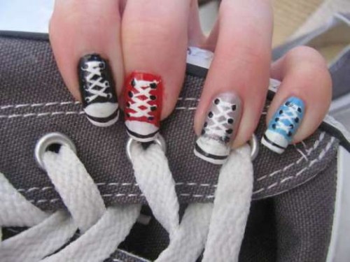 Jest też propozycja dla fanek popularnych trampków. Posznurowane paznokcie z pewnością wpadną w oko naszym młodszym czytelniczkom. Z takimi pazurkami można zawojować każdą szkołę, czy wieczorną imprezę. Kolorystyka jest dowolna. Możecie dobrać kolor do pary waszych trampków.